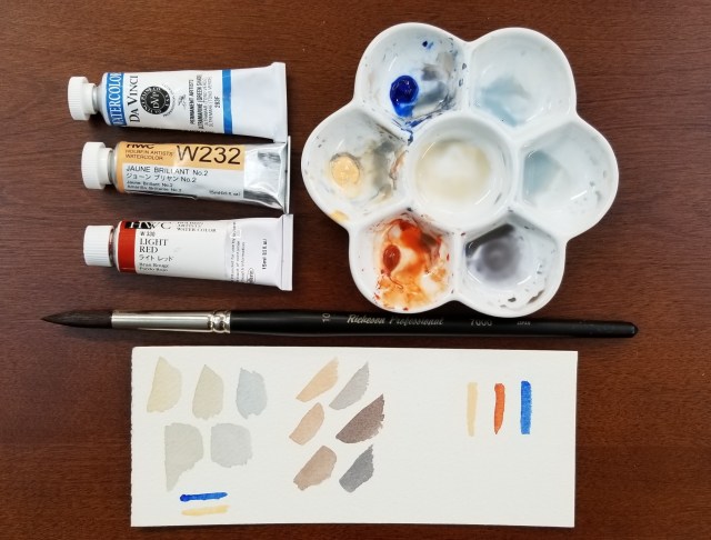 Here is what I use to make one of my favorite grays – and some other lovely neutral colors: Ultramarine (Green Shade), Jaune Brilliant No. 2, and Light Red. I am using Da Vinci and Holbein watercolor paints here, but you can use a different brand or a student grade paint or even a similar color combination from a Crayola watercolor set!