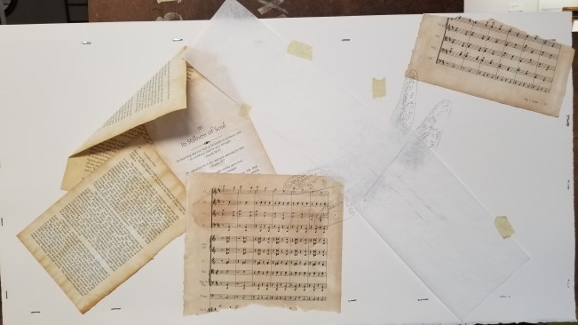 This is how the visible start looks (after my perfectly executed mental painting, of course). I’ve got my book pages down and I’ve drawn my dragonfly. I am trying out a new idea with the pages arranged haphazard – like a gust of wind blowing them away.