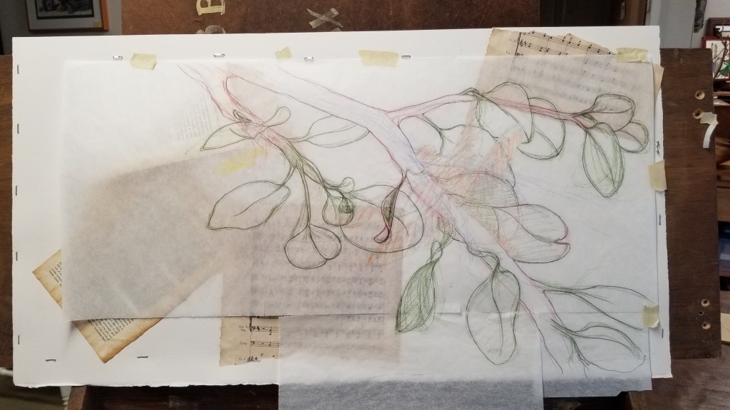 I usually have my whole composition decided before I start on the final piece. This time, I kept making decisions and changes as I drew! I didn’t want to damage the watercolor paper with multiple drawings and erasing, so I used tracing paper to sketch and then transferred the final lines onto the watercolor paper. For this painting, I placed the dragonfly first, then made the eucalyptus branches work around it.